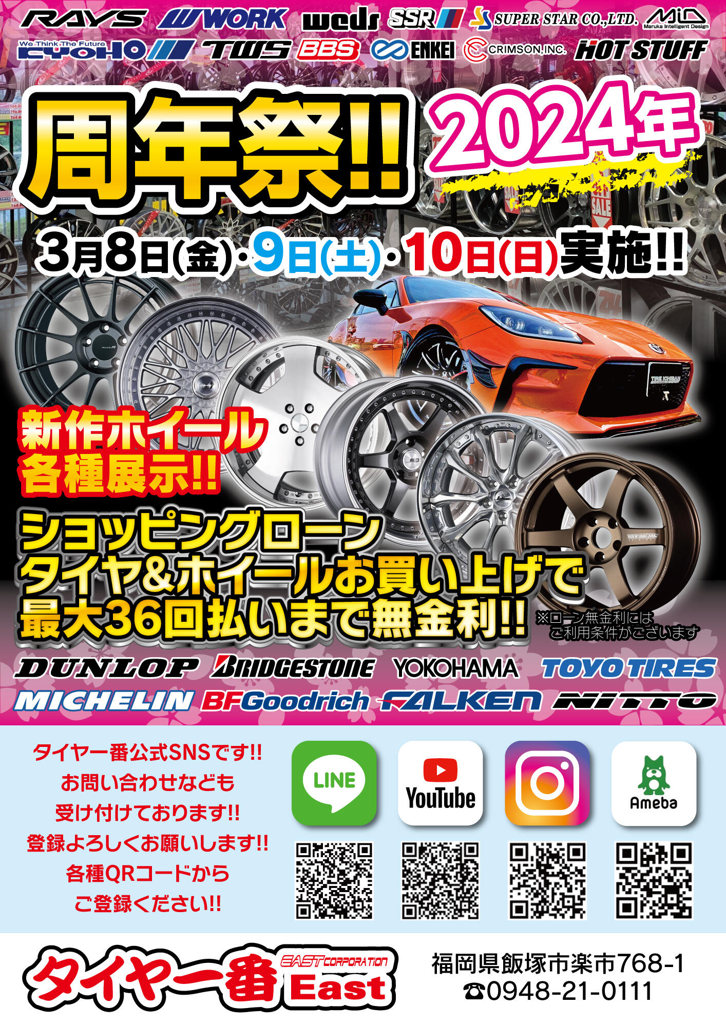 3/8-10 福岡県にあるタイヤ一番イースト店さんにて、「2024年周年祭」が開催されます。