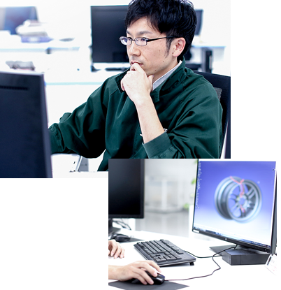 自動車メーカー向けの四輪・二輪アルミホイールの製品設計と解析を行うのが、私の仕事です。お客様からいただいたデザインやご要望を受け、3次元CADを使ってモデリングを行い、強度解析や凝固解析を行います。最終的に製品図面まで仕上げます。